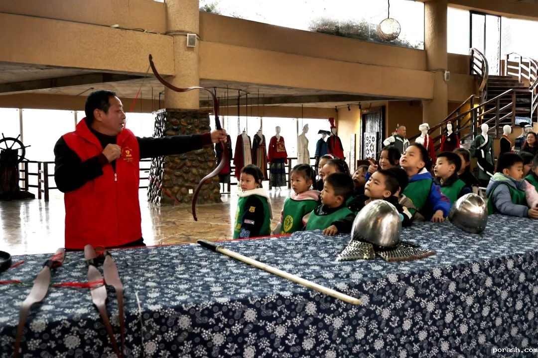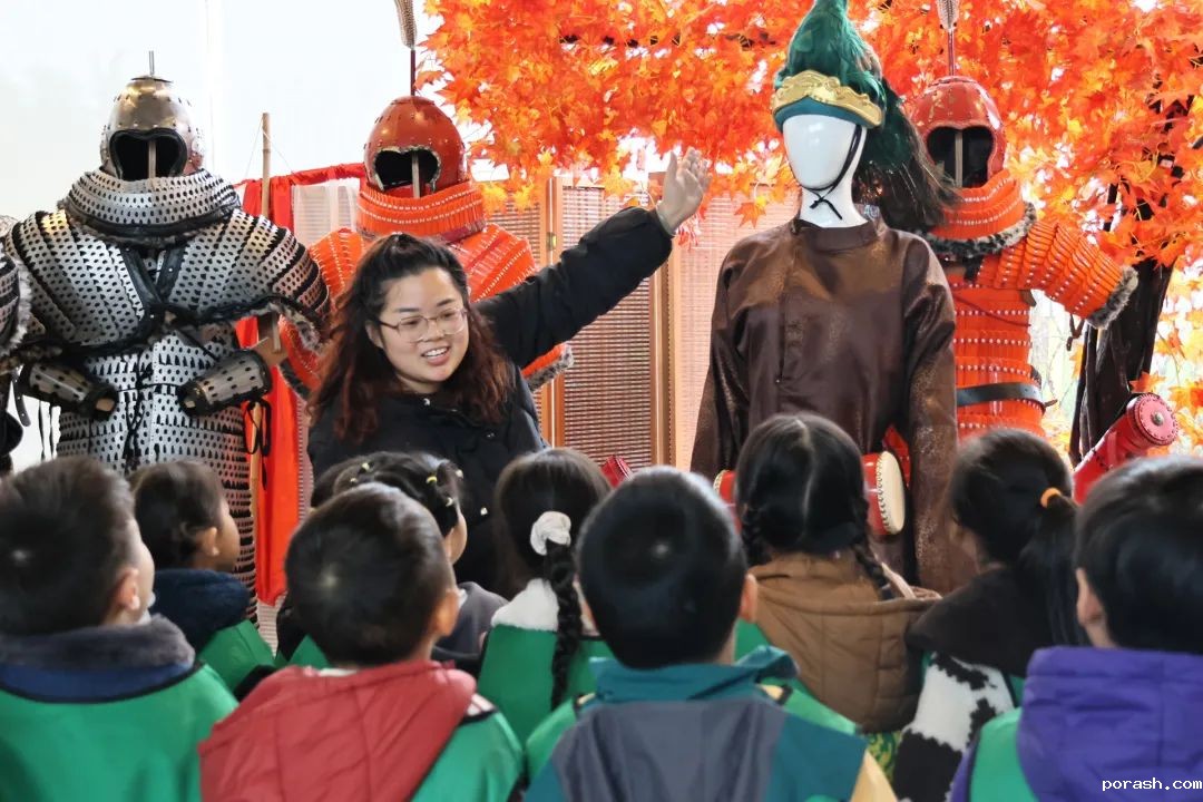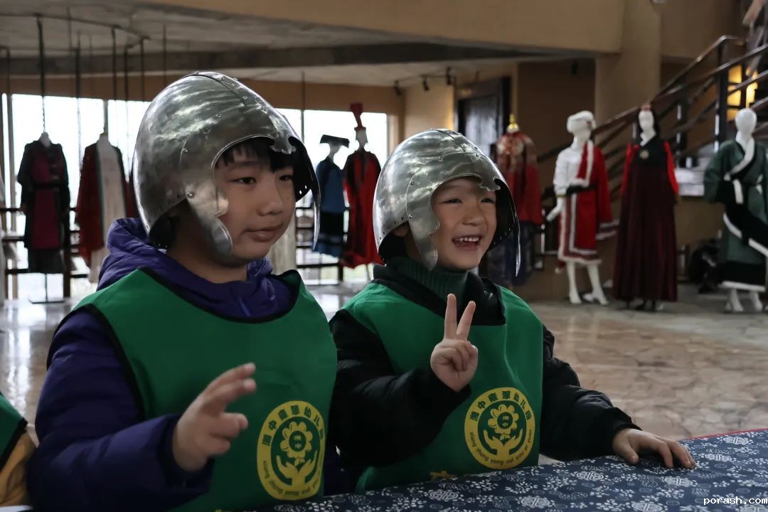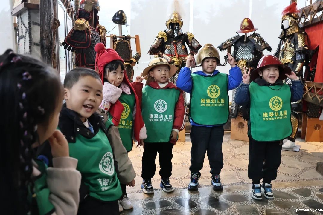 展览现场,幼儿园的小朋友们在老师的带领下,参观各式各样的甲胄和民族服饰。孩子们的眼睛里闪烁着好奇的光芒,当看到威武的甲胄时,兴奋不已。有的小朋友还忍不住戴上甲胄的帽子,仿佛瞬间化身成了古代的将军,感受着那份威武与豪迈。